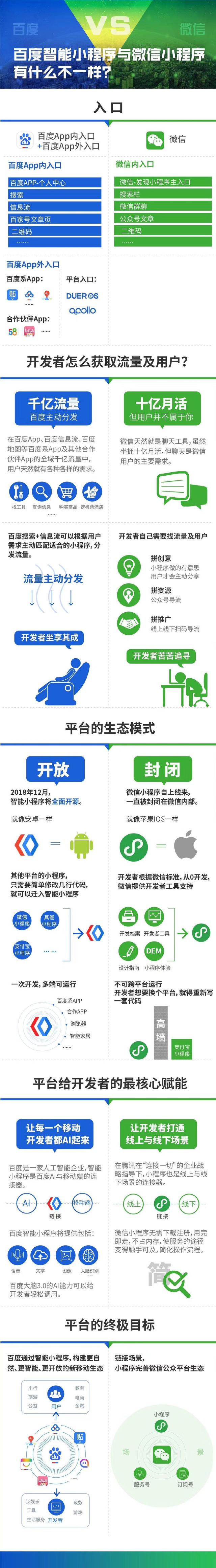 隨著微信小程序持續(xù)的告訴發(fā)展,又加之百度發(fā)布了百度智能小程序,最近,很多客戶都咨詢我們兩者之間具體有什么區(qū)別?做哪款小程序更適合企業(yè)?根據(jù)客戶的反映,我們綜合整理了一下,通過下面的圖來跟大家說說百度智能小程序與微信小程序之間的區(qū)別,但是,具體您要做哪款還是要根據(jù)您的實(shí)際需求來定,比較兩者之間的側(cè)重點(diǎn)是不一樣的!具體戳圖來看...